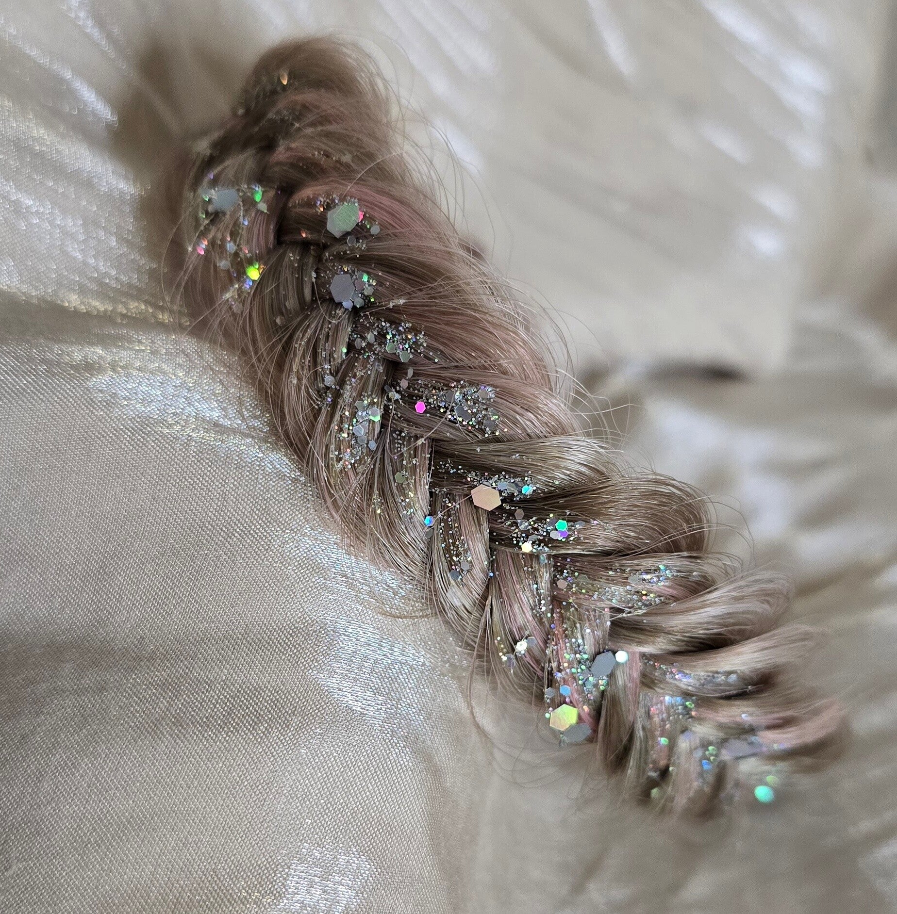 De haarband is gemaakt van hoogwaardig synthetisch haar, waarbij de glitters met zorg zijn aangebracht voor een stralende, feestelijke look.